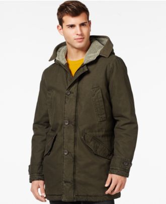 This easy-going anorak from GUESS brings out your laid-back style and offers extra warmth with an attached faux-sherpa trimmed hood.