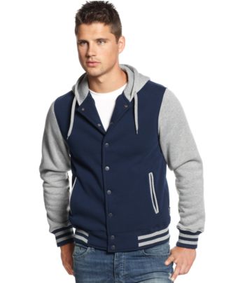 Work the preppy, collegiate look with this cozy colorblocked Ring of Fire hooded varsity jacket.